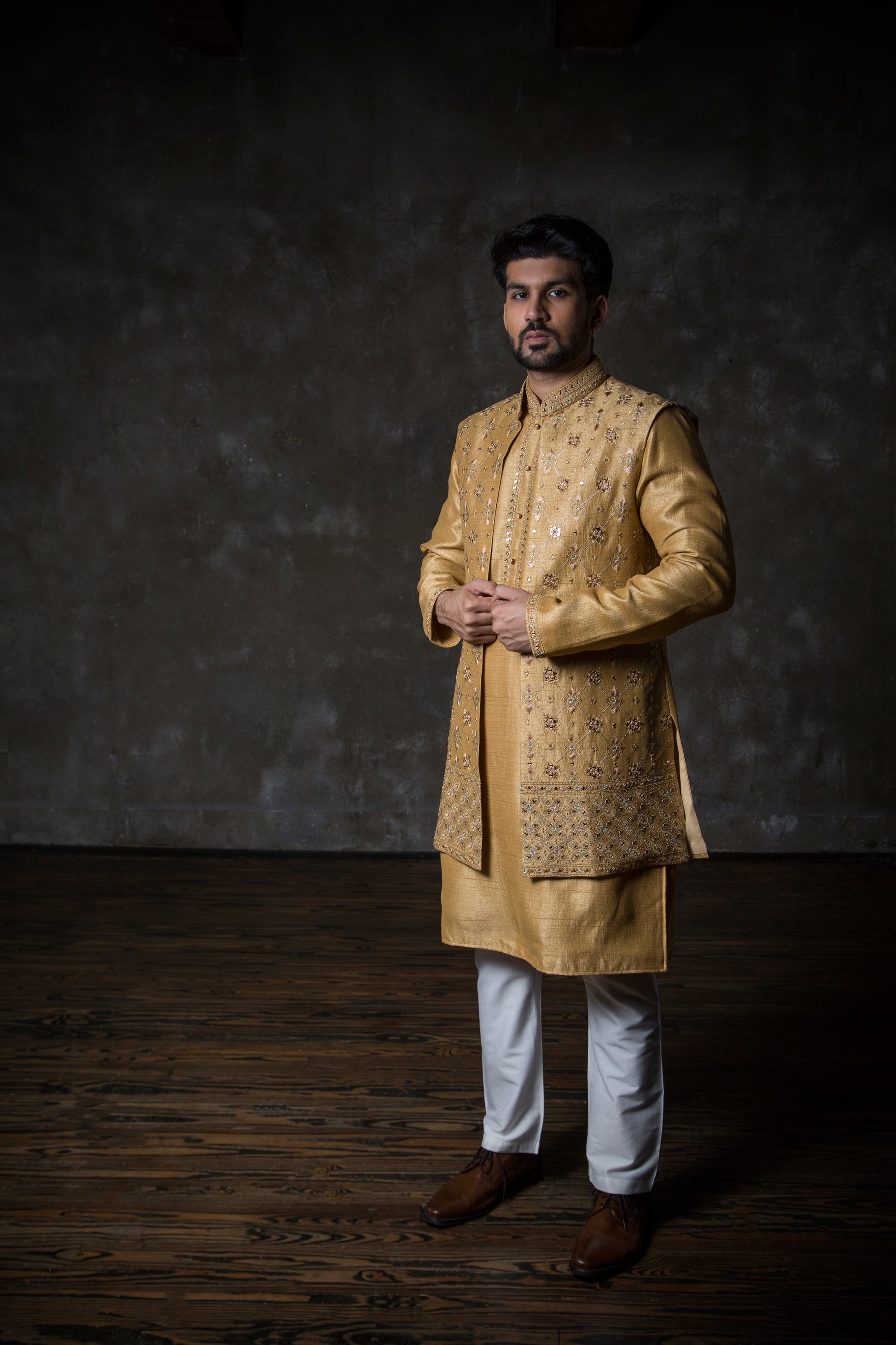 Dark Yellow long jacket highlighted with delicate floral embroidery with Mirror Work, open neckline, and sleeveless. The set comes with a matching kurta and off-white pant-style pajama or matching pants as per customer preference.