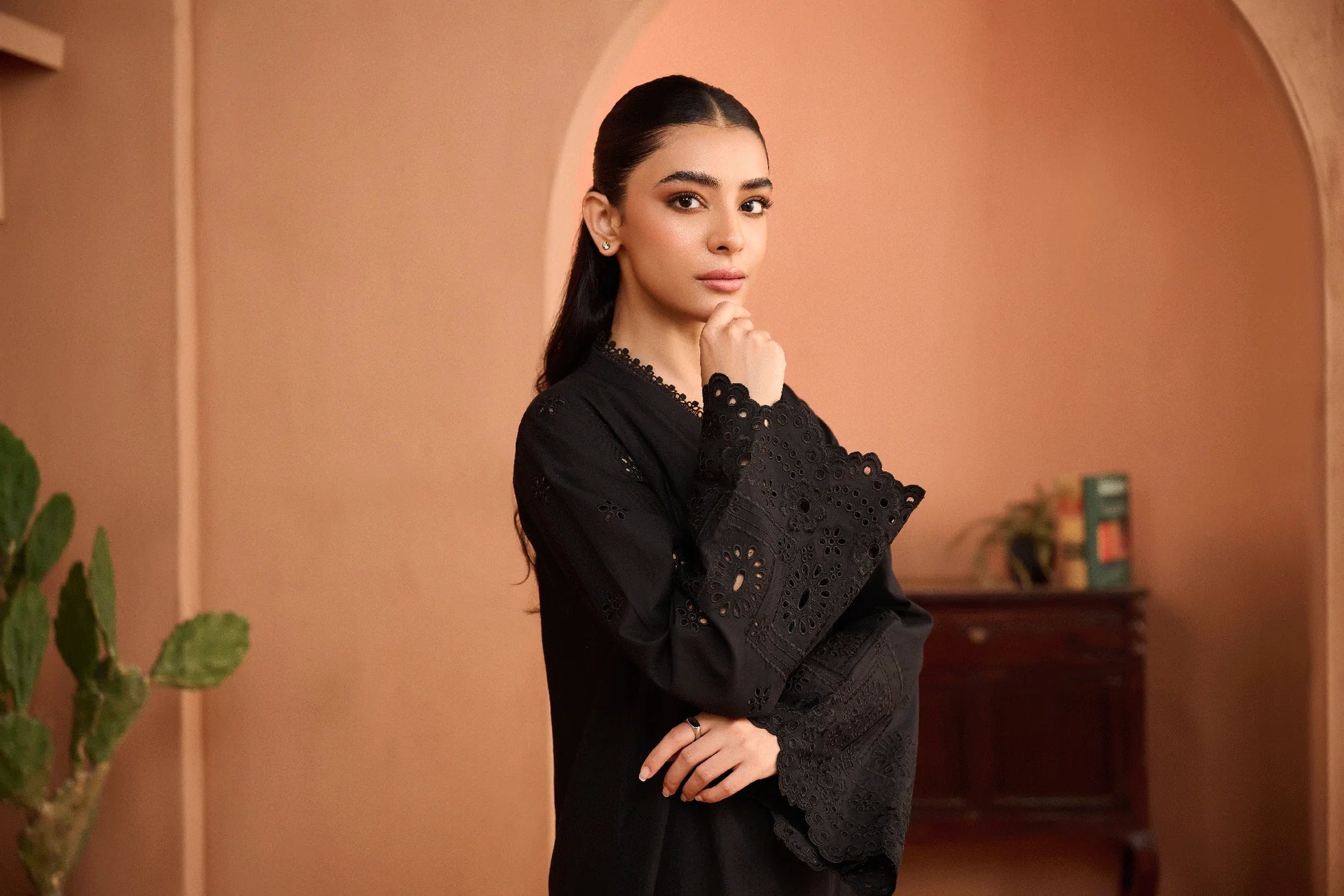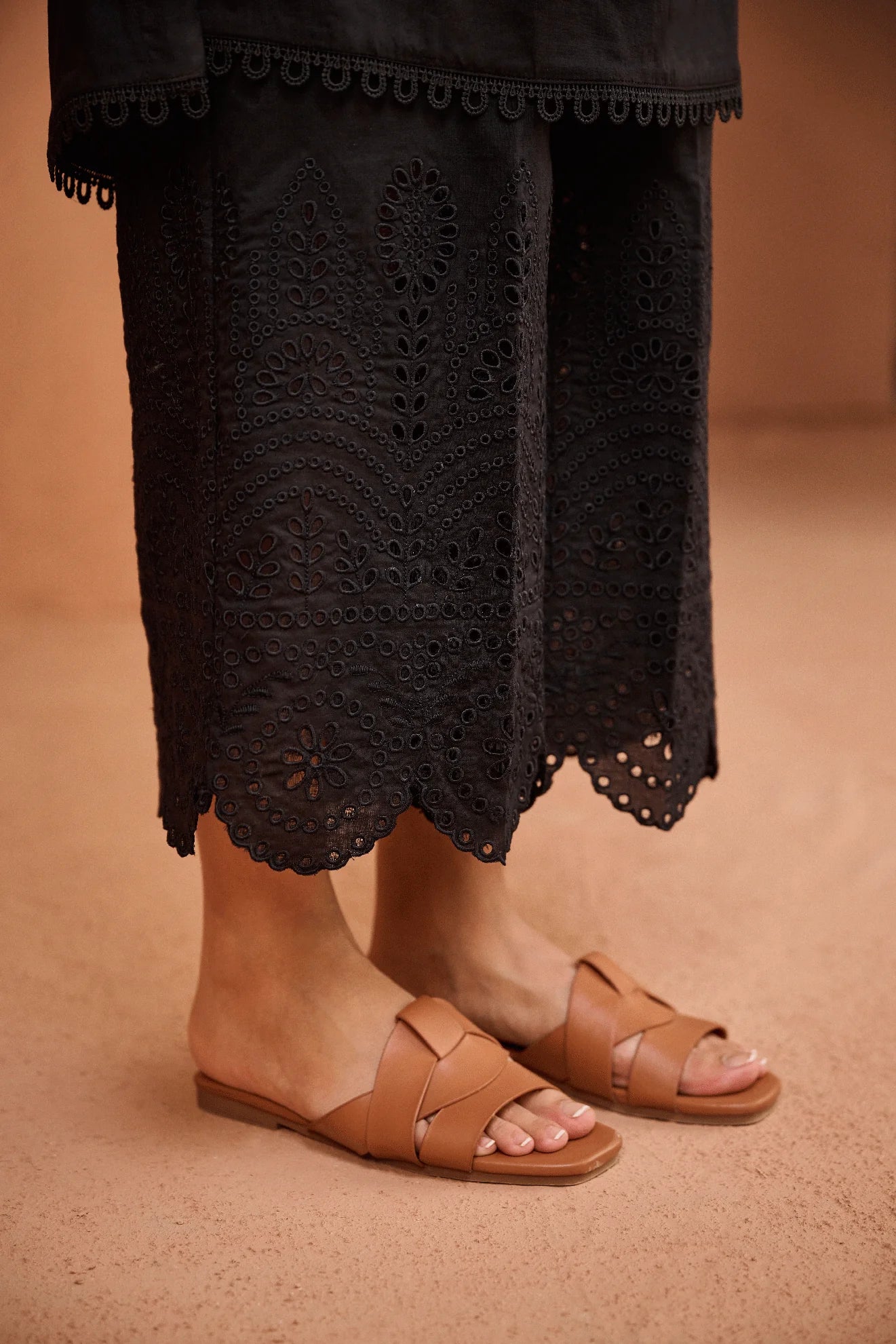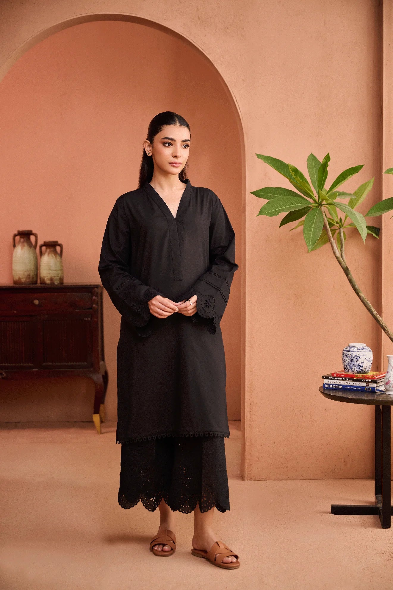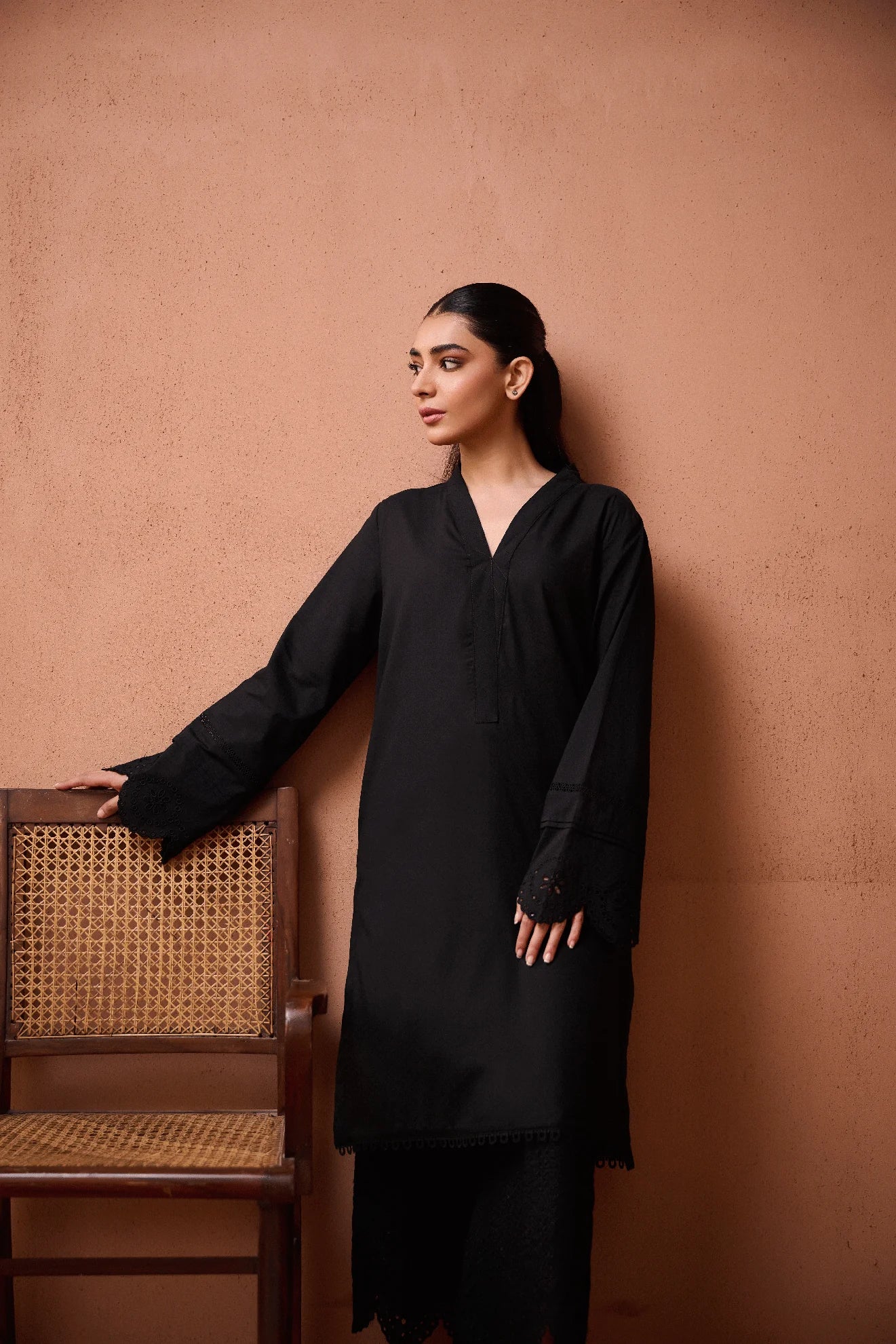 This black kurta set from our Noir Collection is a timeless piece crafted from lightweight and breathable lawn fabric. With a monochrome design, it effortlessly exudes charm and sophistication. Perfect for any occasion, this set offers both comfort and style. Complete your look with our Noir Collection.