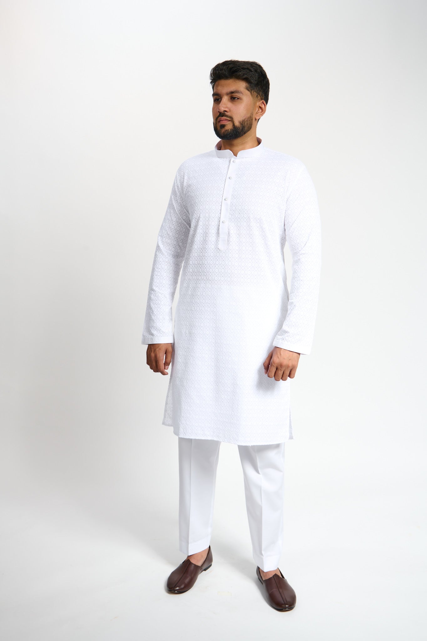 This elegant Menswear White Chikankari Kurta is the perfect blend of contemporary design and traditional fashion. The intricate, delicate embroidery makes this garment an exclusive statement piece of timeless elegance. Luxurious in every stitch, this piece is the perfect addition to any wardrobe.